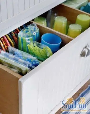 选择一个大抽屉用做细小器物分类摆放区。不妨用剪开的纸巾盒在大抽屉里做一些随时可以调整的围挡,将大抽屉分隔成四到六个小收纳区,保证厨用细小器物都能回它的“集体宿舍”,不与其他物品“混居”。