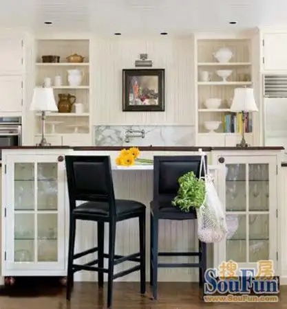 在岛台下设置一对带有玻璃面板的底柜,优雅地朝向开敞空间,展示出它最整洁的一面。