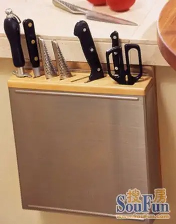 原木材质的刀具架搭配金属贴面,收纳出一室的整洁。根据你的烹饪习惯,安装在厨柜的一侧或是料理台的墙面上,都是非常顺手好用的。