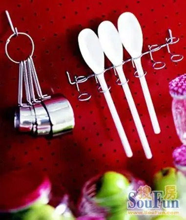 厨房是最考验你利用收纳工具的绝佳地方。搁架、收纳篮、S型挂钩都是不错的选择。特别是结合不同构架的厨柜,其收纳效果往往事半功倍。