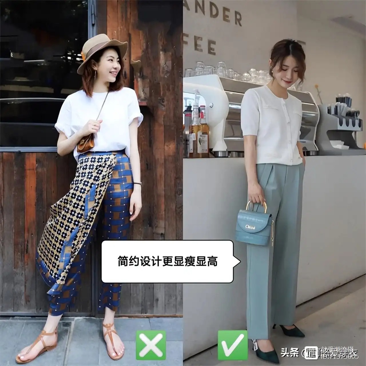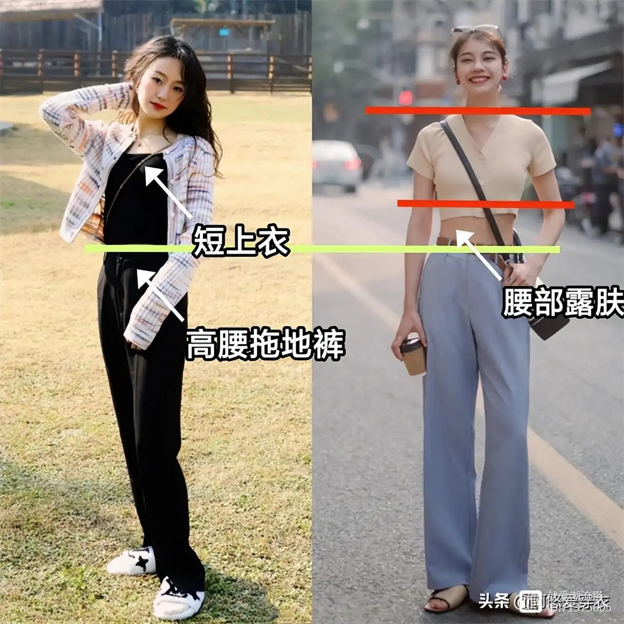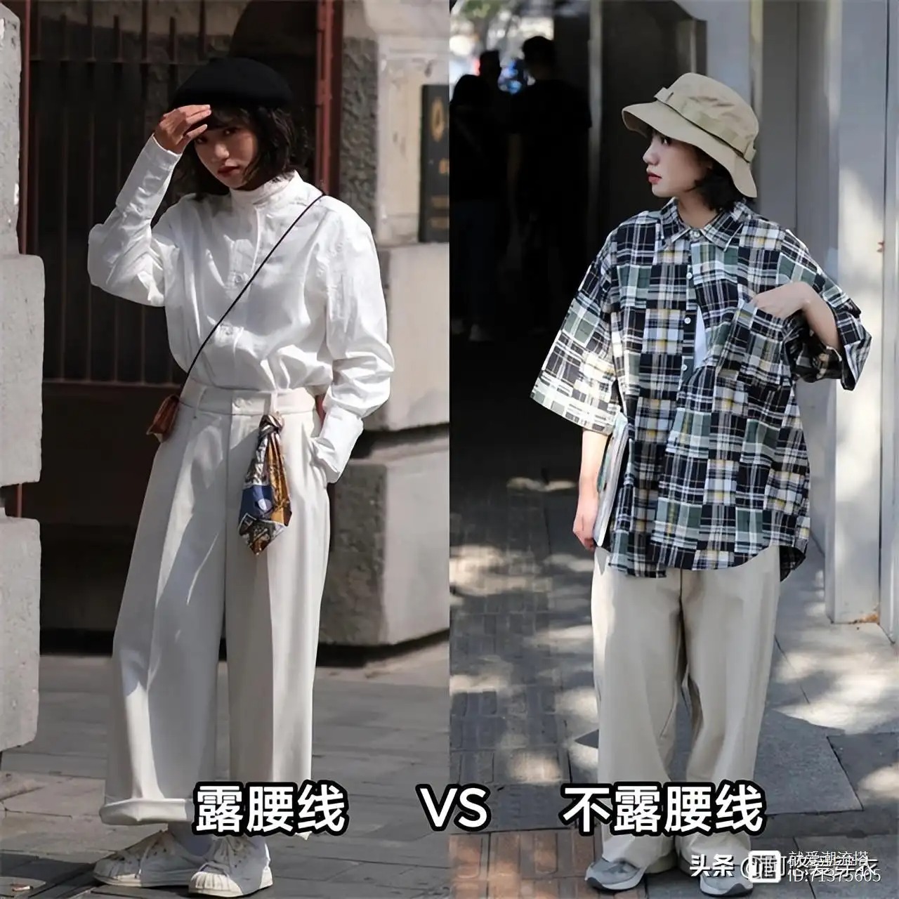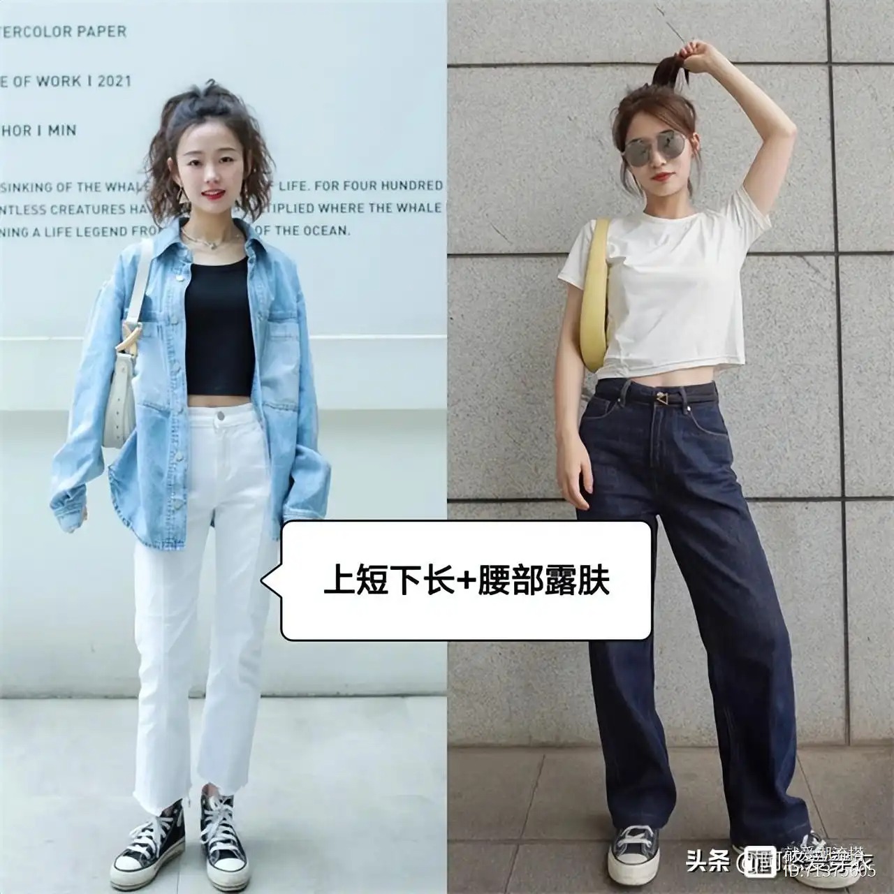 那就要看露腰线了。露出腰线,就能优化身材比例,要是像右边这样不露腰线,那就更加显矮了哦~