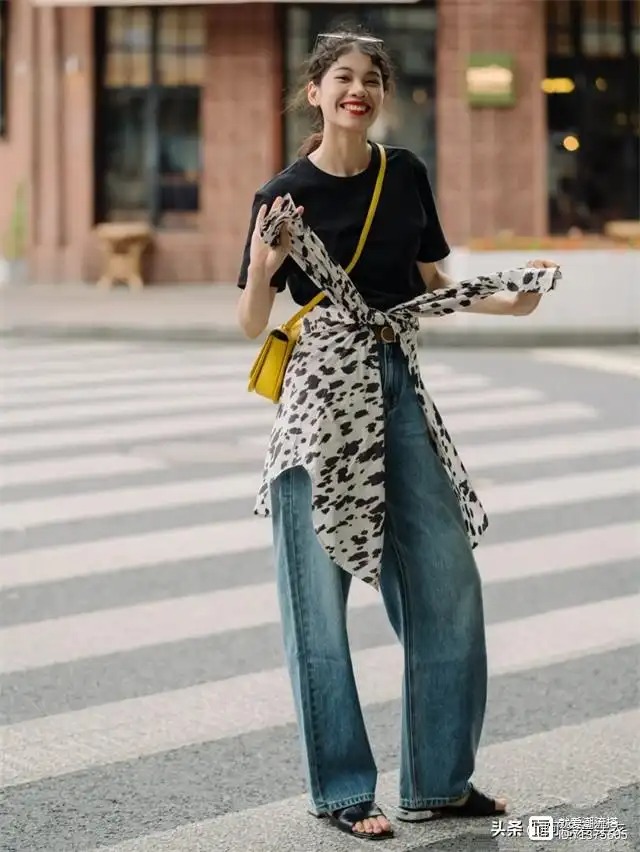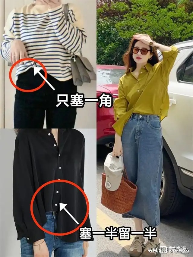 衬衫、开衫等外套式上衣可以解开下摆的几颗扣子,用塞一半留一半的方式穿着;如果是卫衣、T恤等宽松版型的套头式上衣,可以只将衣服的一角掖进裤腰里,既穿出了高腰线,也不会显胖哦~