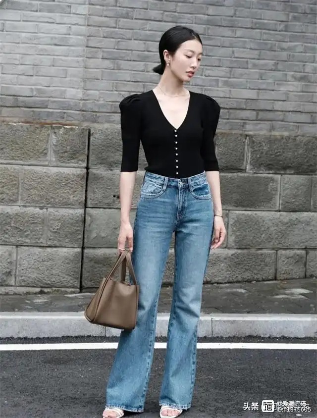 性感的v型领口让小个子也能拥有优美的天鹅颈。黑色修身的法式上衣搭配高腰牛仔阔腿长裤,巧妙地三七分让身材轻松变成人人羡慕的黄金比例。