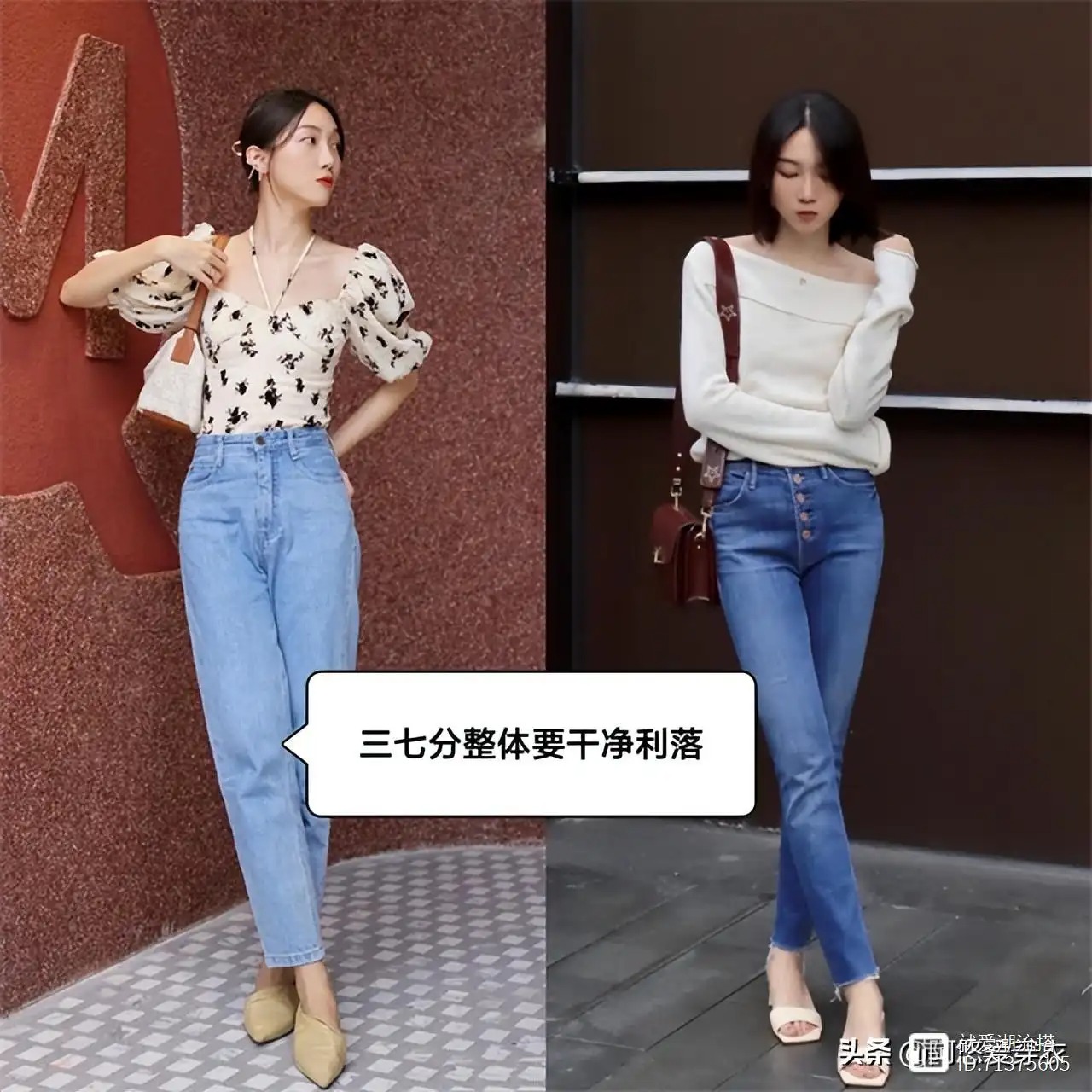 如果你选择的露踝裤裤管偏宽松或有明显的高腰设计,那可以适当选择夸张一点的三七分比例。