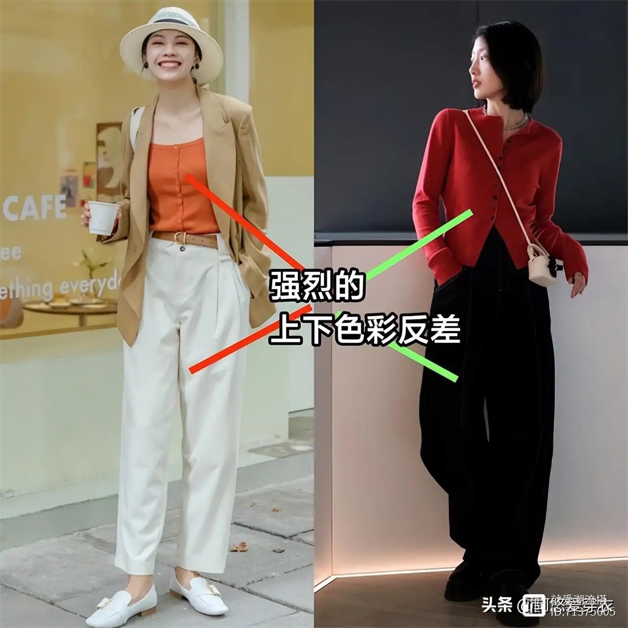 腰粗胯宽的姐妹可以用上衣和裤子的色彩反差来打造出明显的腰部分割线。比如左边的橙白搭配,右边的红黑对比,结合上短下长的穿法,同样也很赞!