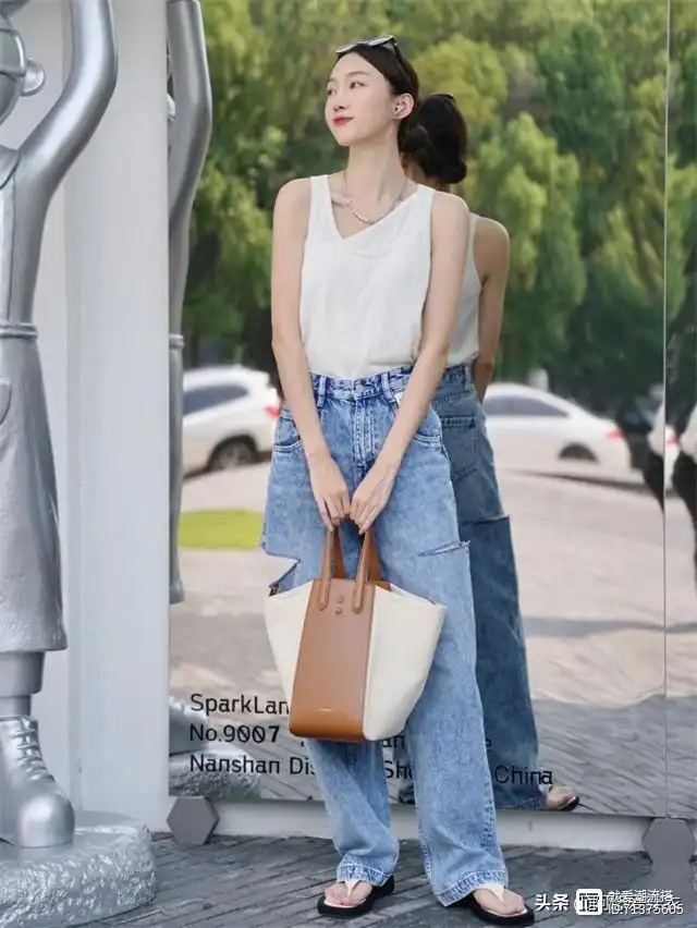 刚好能够露出脚踝的九分裤或八分裤不适合过于夸张的高腰线比例。要是腰线的位置过于靠上,反而会给人刻意的感觉。