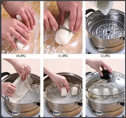 5、馒头放入蒸笼时,应将蒸笼布打湿,蒸熟的馒头与蒸笼布粘在一起,这是因为蒸笼布太干的缘故。