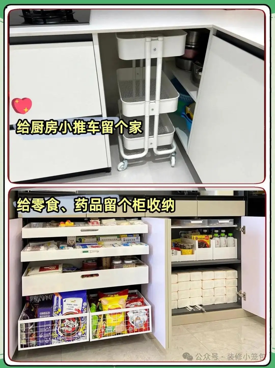 3. 厨房:使用挂杆和挂钩,将小工具垂直收纳上墙;在吊柜内安装拉篮,方便拿取物品;使用分隔板将抽屉划分成不同空间,分类摆放物品;用文件盒收纳厨房锅具。