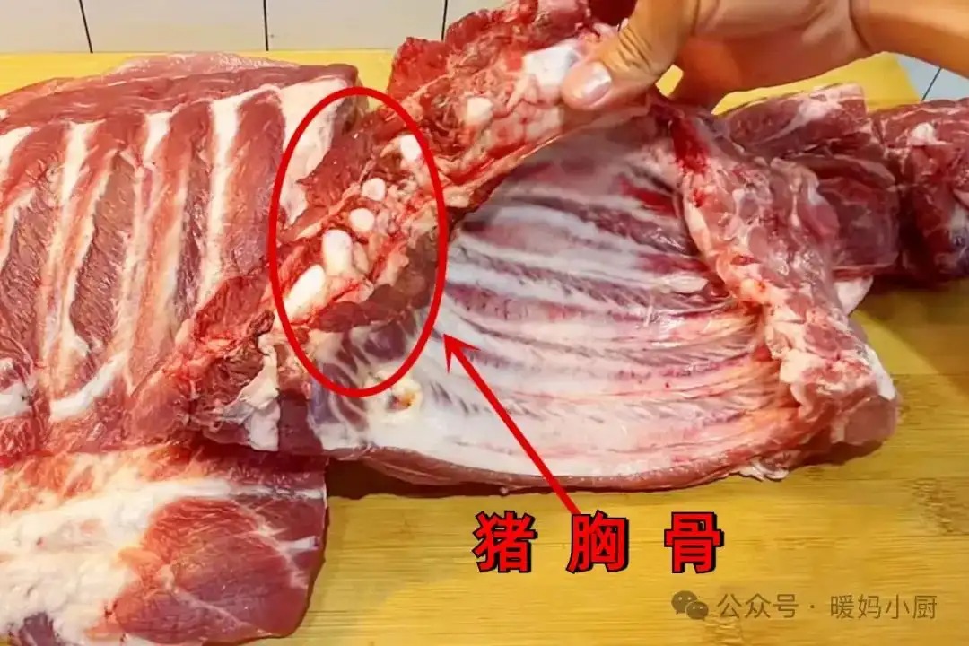 老规矩,先揭开谜底,这块肉就是猪胸骨,也叫作软骨边,软骨肉或者是猪脆骨。为啥说猪身上的肉就属这块最值钱呢?首先是因为这块肉的产量太少了!它是位于排骨的边缘,靠近猪胸,也就是猪肚子那里,与排骨连在一起。一头猪只有两扇排骨,而猪胸骨只在这两扇排骨中的小肋排上有,也就是说,一头猪顶多有一两斤猪胸骨,所以物以稀为贵嘛!