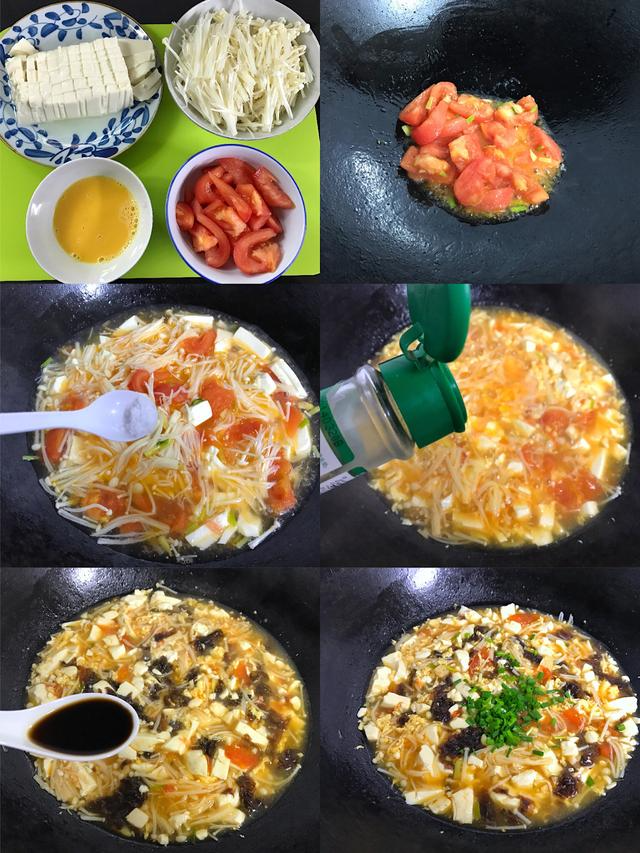 、先把食材处理好,番茄去皮切小块,鸡蛋打入碗中加点料酒打散,豆腐冲洗干净后脱入盘中,切成小块,金针菇去掉根部,清洗干净后一切为二。