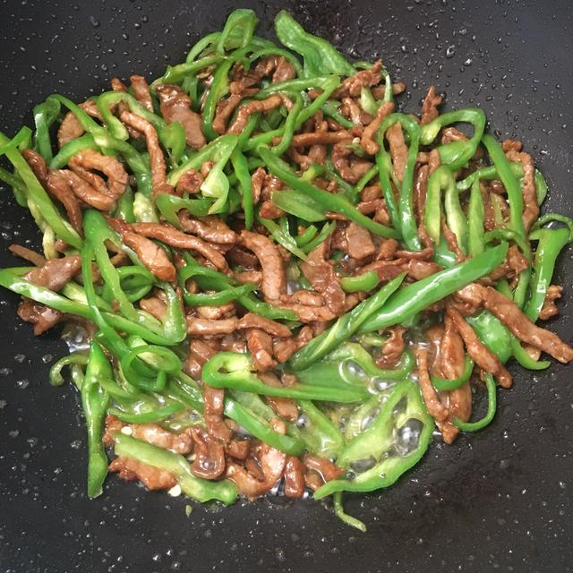 4.另起锅炒青椒,加少许盐、味极鲜和十三香,炒至软榻后倒入炒好的肉丝,翻炒均匀即刻出锅
