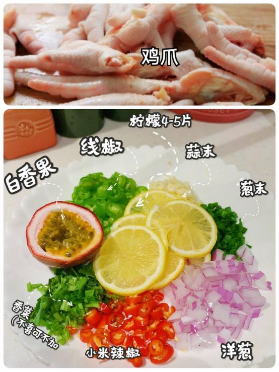 用料:柠檬片、凤爪、料酒、姜片、葱、小米椒、蒜蓉、生抽、醋、糖、香油