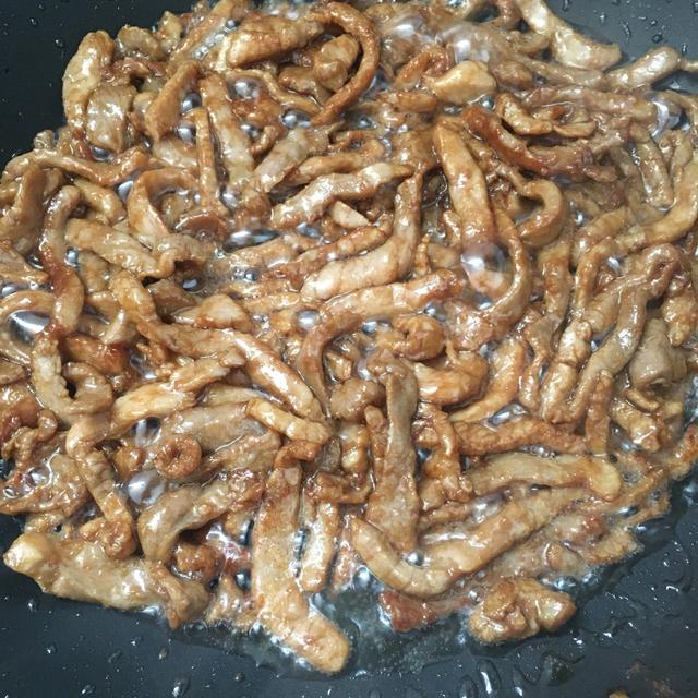 3.锅里倒油先炒肉丝,肉丝炒熟后盛出来备用