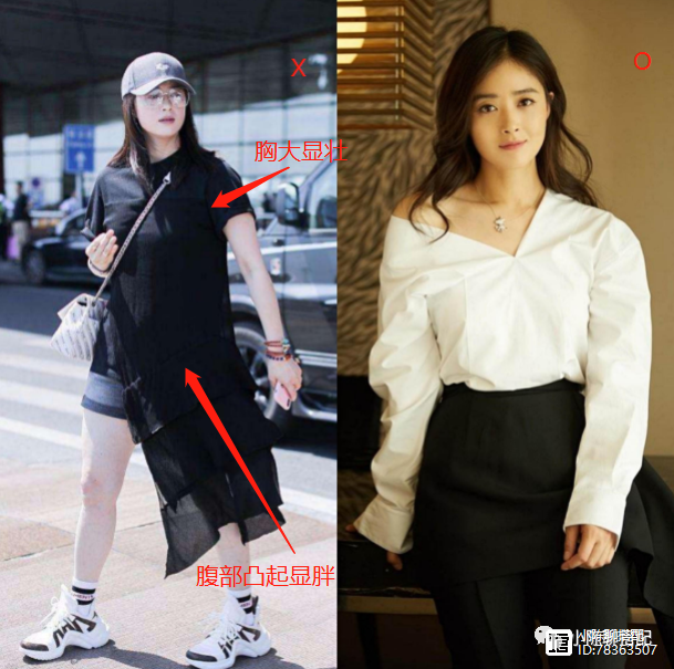 针对这个问题,我们可以根据下面这张图来思考答案。首先来看看右边蒋欣的穿搭,一件不规则的纱质黑衫衣搭配黑色短裤,估计是希望可以用黑显瘦,但即使是“全黑”了,我们却还是可以发现,这套穿搭没有戳中大胸、肥腰等苹果型身材的要害,整个人依旧是显矮又显胖。