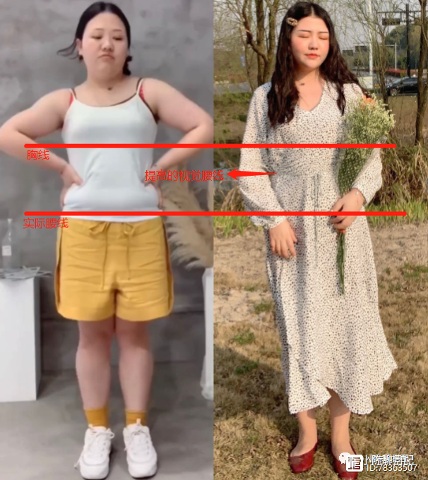 以下图为例,胸线与实际腰线之间的距离虽会以个人身材的不同而不同,但一般都是从上到下由瘦到胖这样一个过程,所以,视觉腰线一定在这个区间中,同时为了“收腰不显肉”,视觉腰线的位置最好是高于赘肉低于胸线。