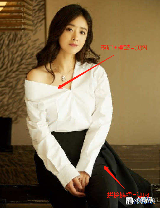 然后右边蒋欣的穿搭明显就要聪明的多,斜字V领的白色衬衫露出了小半边肩膀,修饰脸型和胸部曲线,条条褶皱的设计进一步缩小胸部宽度,显得性感又不低俗;下半身的黑色不规则拼接裤裙,遮肉又不全包,露出了瘦细的腿部,显瘦又显高,令人不禁拍手叫绝!