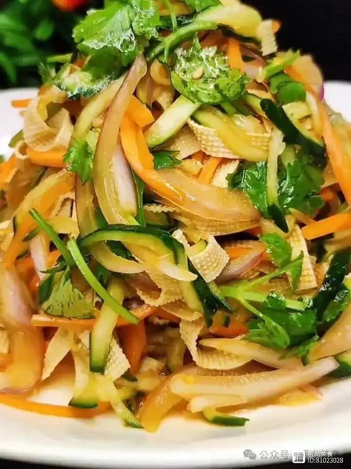 3、将切好的豆皮丝、黄瓜丝与胡萝卜丝置于容器中,倒入调好的料汁,充分搅拌均匀。