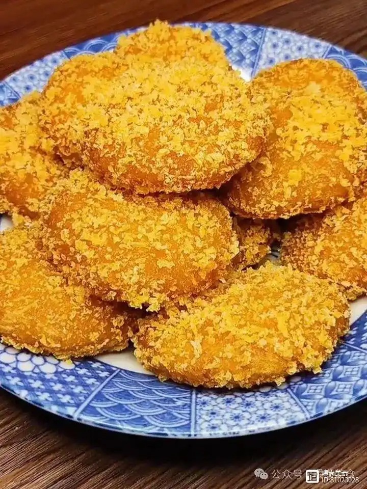 3、将油锅预热至五成热,将裹好面包糠的南瓜饼放入油锅中,用中小火炸至表面金黄且内部熟透。