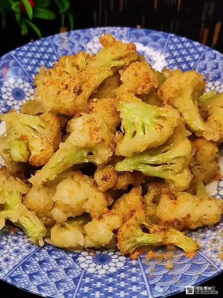 2、将油锅预热至五成热,将裹好脆皮糊的菜花小段逐一放入油锅中,保持小火慢炸至表面金黄且酥脆。