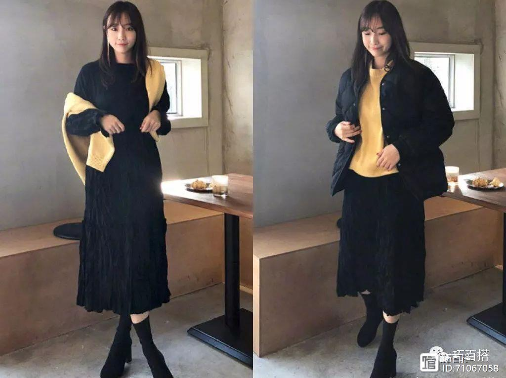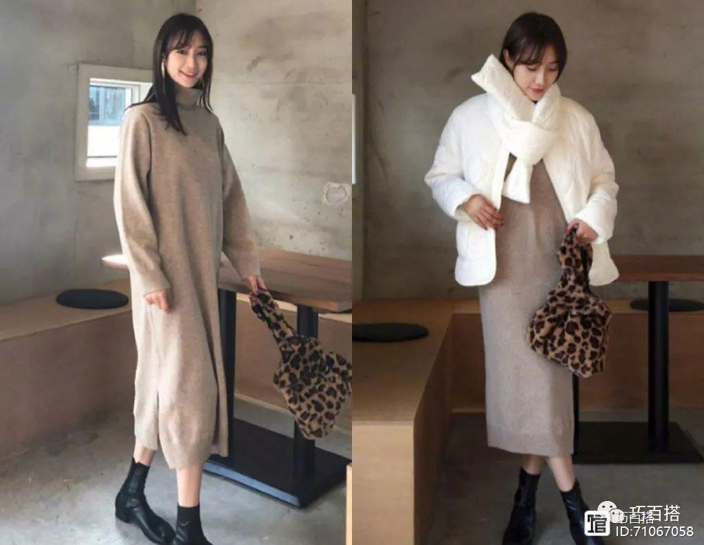 宽松版型的毛衣裙穿着舒适,所以非常受到很多女孩子的喜欢,其实毛衣裙不仅穿着舒适百搭,同时也非常的适合与短款的羽绒服做配,不仅显高还非常的气质。