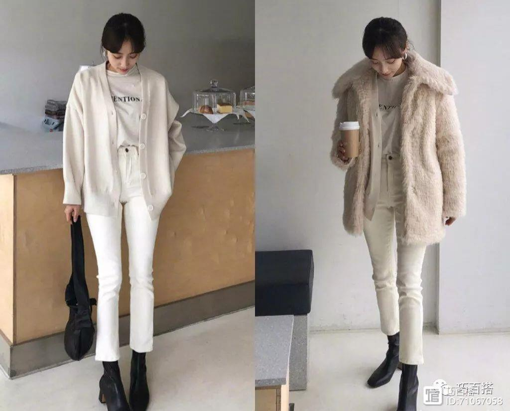 这两套搭配一套比较适合现在这个季节穿着,另外一个可以选择在春季的时候穿着。颜色采用了最为百搭的米白色,米白色是非常的适合亚洲人的一个配色。搭配的小脚裤也是非常的显瘦,蛮种草的。