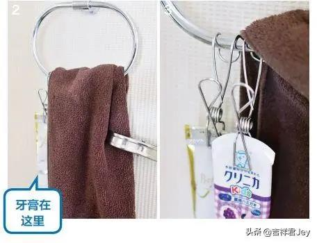 就像上图所呈现的,洗面奶、牙膏等软管类物件可以用不锈钢吊夹悬挂在毛巾杆上。