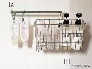 洗发水瓶可以装在不锈钢钢丝架里,然后借助钩子悬挂在毛巾杆上。