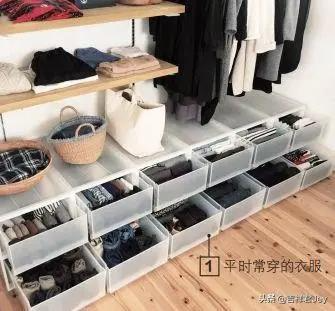衣橱下段的内侧可以存放非当季的衣物, 外侧则放上深度较浅的收纳盒,这样充分规划以后,衣橱便由内至外得到了充分利用。