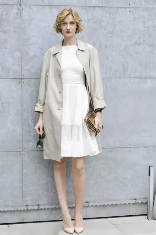 Eva Riccobono用挺阔的风衣搭配轻盈的雪纺连衣裙,是春天最优雅的打开方式,裸色尖头高跟鞋消失在小腿之上,将一双美腿映衬得无限长。