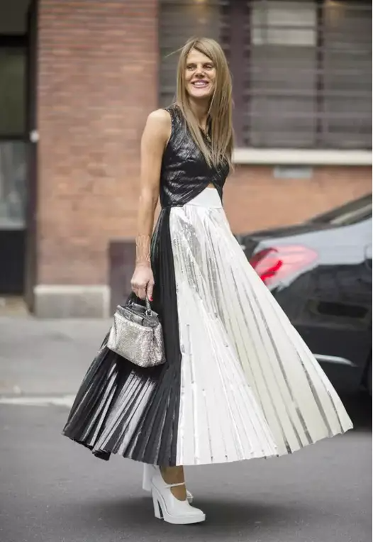 超短上衣+过膝百褶裙是优化比例的一组CP,遮住了Anna Dello Russo不完美的腿部,露出最纤细的高腰线。