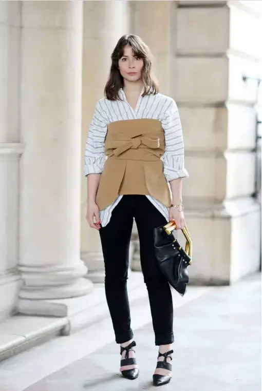 显瘦的手段不仅限于遮,适度地“露”才是最佳选择。秋冬营造大气场的围巾可以毫不犹豫地收起来了。温暖的春日,适当地露出你肩颈,会让上半身看上去更轻盈。一字领的上装,勾勒凹凸有致的曲线,还能与裙子或裤子任意搭配,绝对时髦又实用。衬衣解开两颗纽扣,打造大V领,有效拉长颈部线条,看上去更修长而且性感。