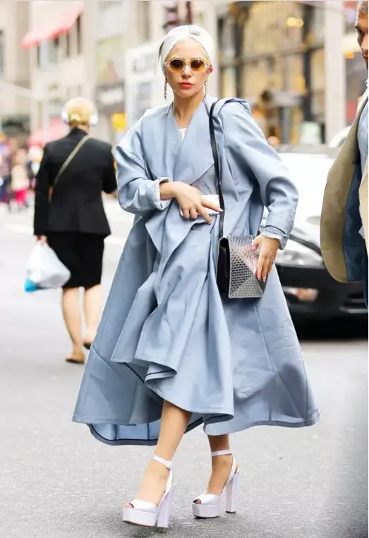 同色搭配没有大家想象的那么难,像Lady Gaga一样,用一件浅紫色风衣外套搭配同色玛丽珍高跟鞋,就完成了最基础款的同色搭配方案。