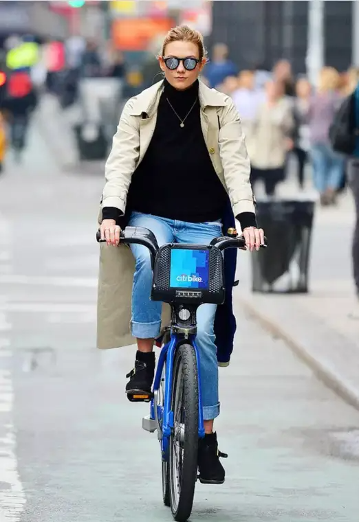 天气晴朗的春日,像Karlie Kloss一样骑行出游吧,风衣搭配高领针织衫、反光墨镜,牛仔裤潇洒地卷起裤脚,防风保暖又有型。