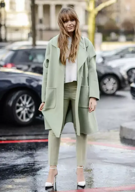 找不全从内到外的同色单品,像时装博主Kristina Bazan一样,下装和外套统配色也是不错的选择,这样的配色方案会模糊掉腿部的界限,让腰部显得纤细,腿部更加修长。