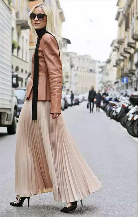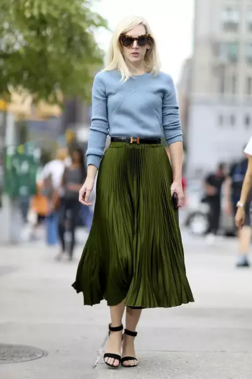 百褶裙搭配薄针织最柔和温暖了,无论是圆领、V领甚至高领的毛衣搭配起来都毫无压力,像Jane Keltner de Valle这样系上一条系腰带,造型更具质感。
