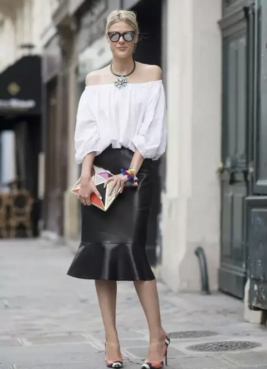 白色以及柔软贴身的面料向来是微胖身材女生的禁忌。但Sofie Valkiers巧妙运用一字领修饰身材曲线,加上挺阔的鱼尾皮裙平衡下半身线条,尖头高跟鞋拉长腿部线条,比例更加好。