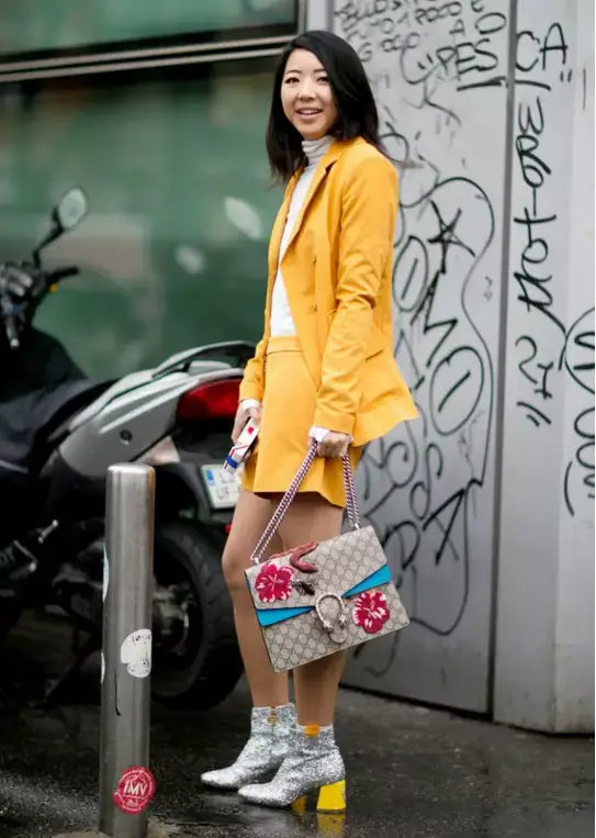 明亮的姜黄色给人暖暖的感觉,合身的小西装加上高腰短裤,把白色打底衫随意扎进一点,永远是显高的法宝。亚裔时装博主Yuwei Zhangzou心机之处在于,鞋跟也呼应了这一身的暖色调。