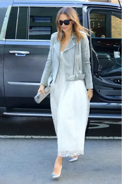 机车夹克与纱裙的组合,刚柔并济,Jessica Alba穿出了减龄的效果,搭配银色尖头高跟鞋。就是完美的春日约会装。