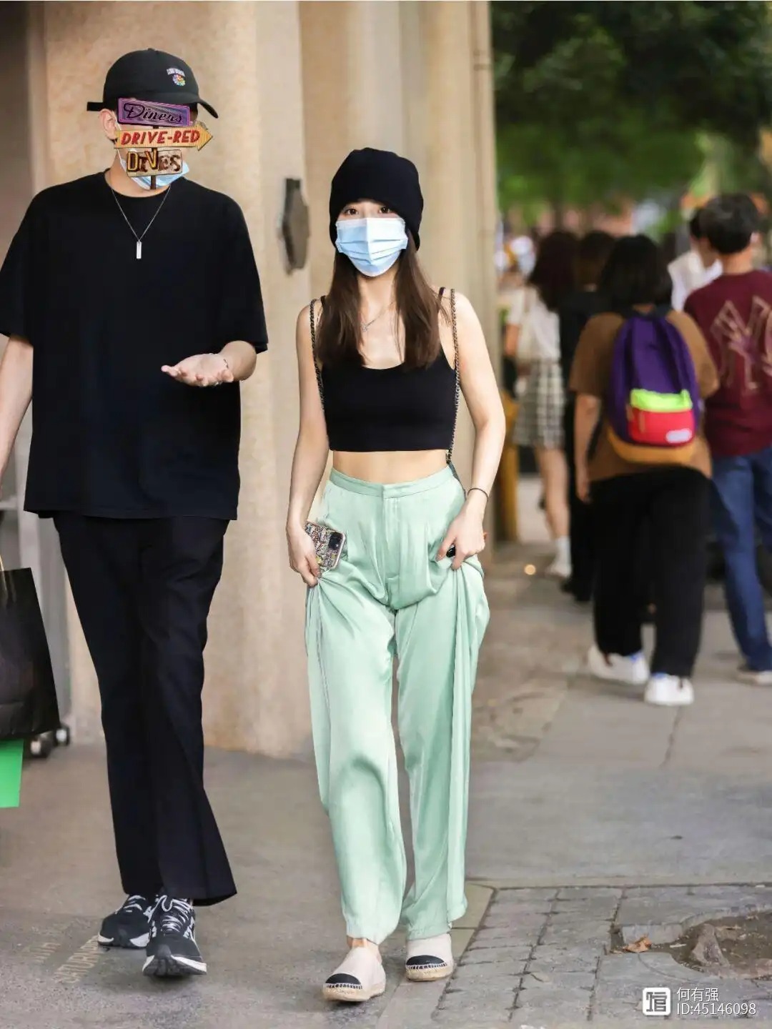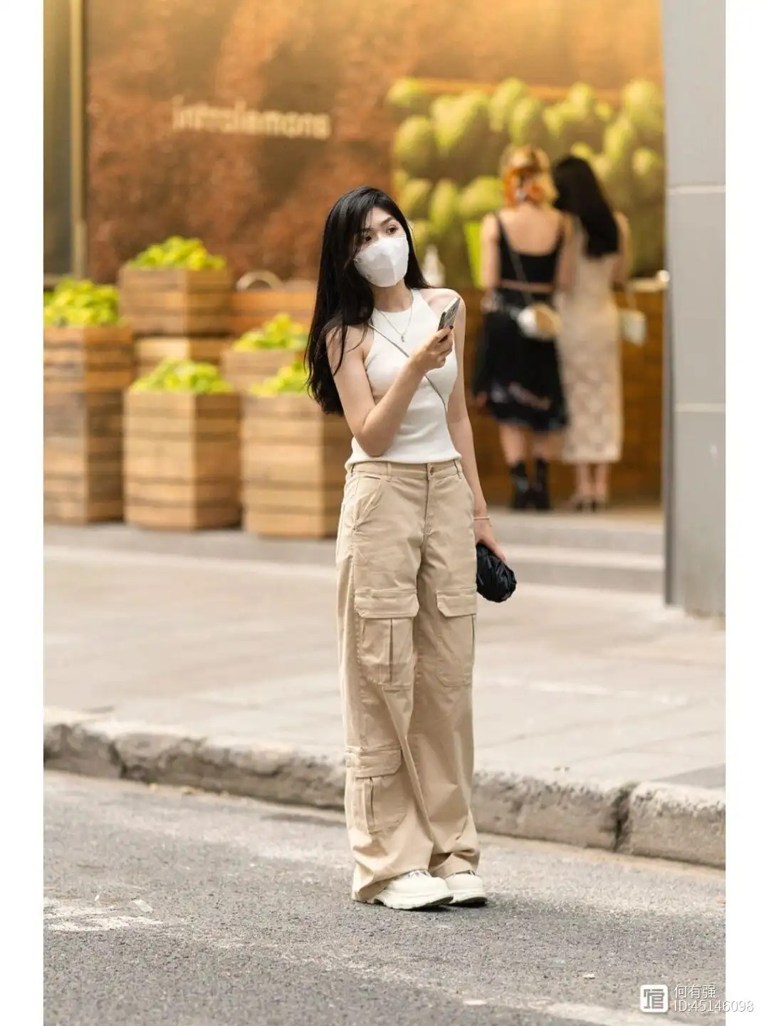 这一身穿搭完全借鉴了中性风格,单品灰色的工字背心搭配上浅卡其色的工装裤,上短下长拉长身材,比例更显高挑,款式设计简洁中性,彰显女性的飒爽帅气,又美又飒,在人群中也足够的抢眼高调。