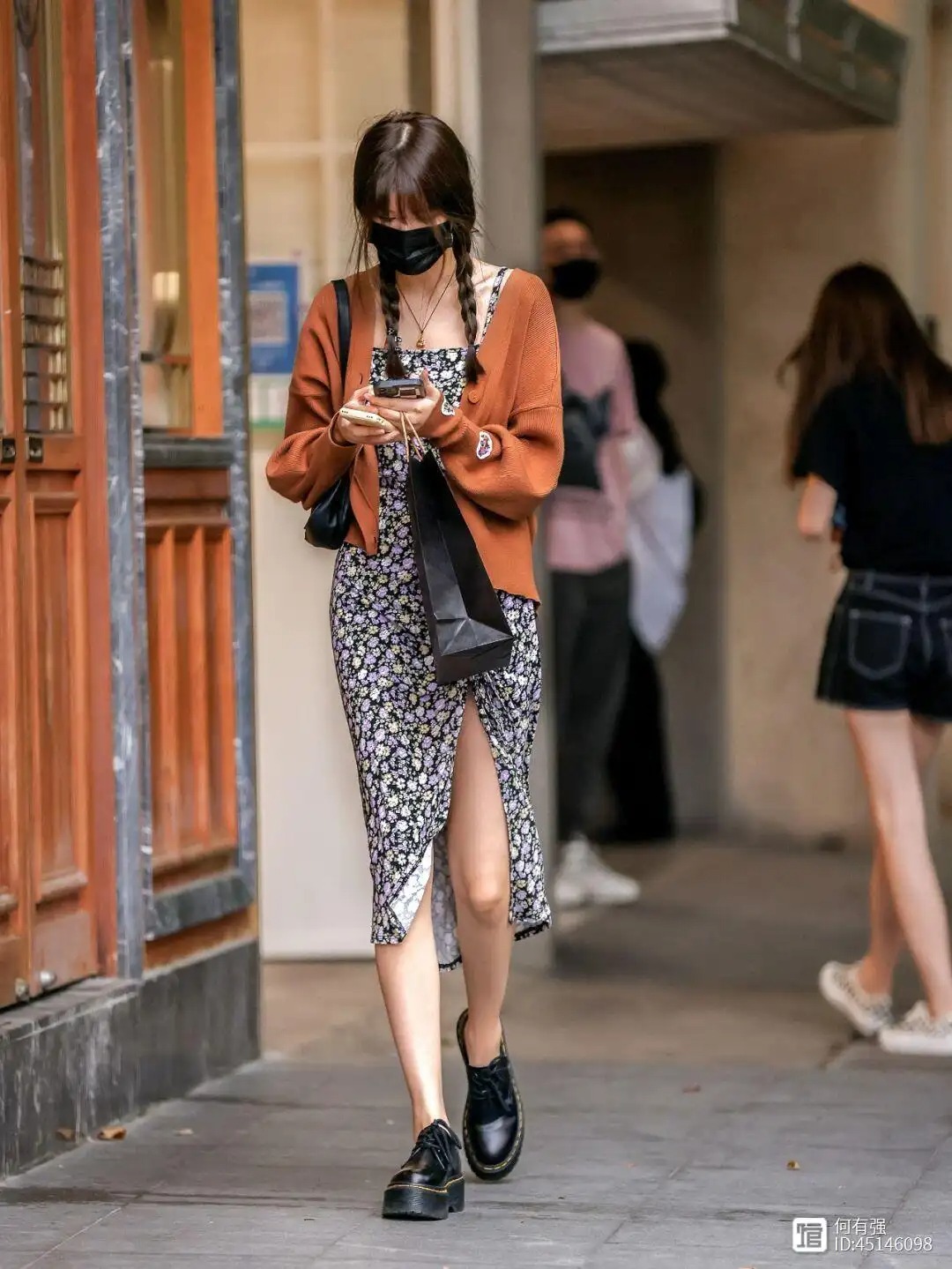 例如穿着开衩的碎花吊带连衣裙,清新又减龄,后面再搭配上一件深棕色的针织开衫,之后既稳重,有足够的优雅温柔,将年轻女孩的甜美和优雅感展现得淋漓尽致。