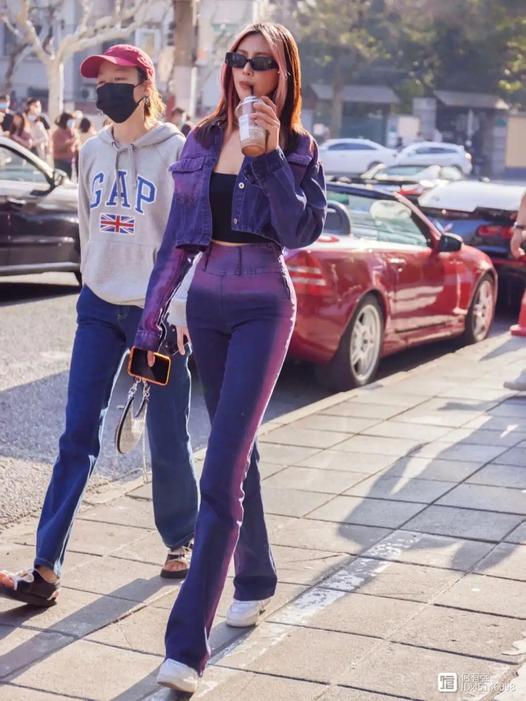 一身渐变的紫色牛仔套装,上短下长,彰显高挑身材,个性洒脱又帅气。很适合95后和00后的小美女借鉴穿搭,更好地彰显出你的个性,变得更加洋气。