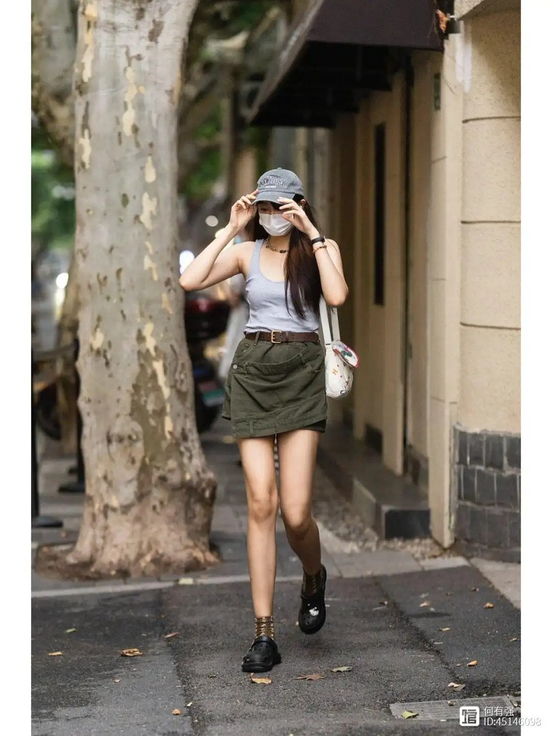 用一件灰色的大圆领背心搭配上军绿色的短裙,颜色搭配简约低调中带有一点点的复古感,同时露肤度比较高,整体气质看上去更为清凉一些,但这样的穿搭对于身材的要求略高一些,如果是微胖女生的话,也可以在外面搭配上长款的衬衫来作为外套,更加的随性慵懒,又能够遮肉显瘦。