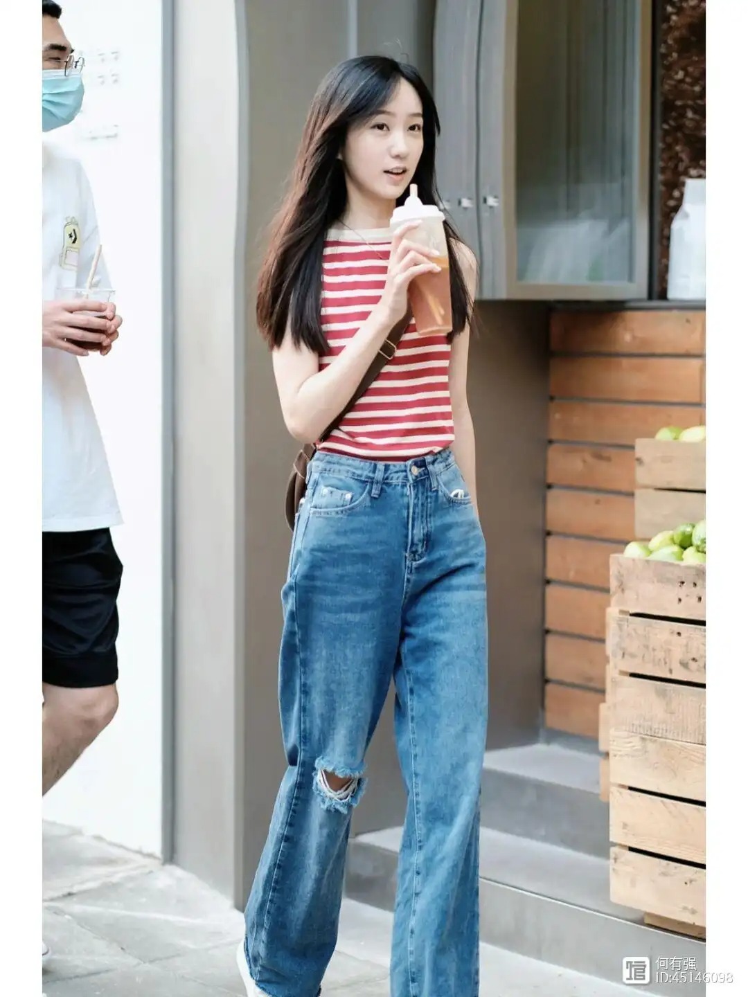 但是也不要太过的朴素简约了,那样反而不显气质,我们可以选择这种红白的条纹背心,颜色上相对要。高调惹眼一些,但是款式简约,搭配上高腰的阔腿裤之后,简洁干净,清爽利落又洋气,这样出街既时尚随性,有足够的低调简约。