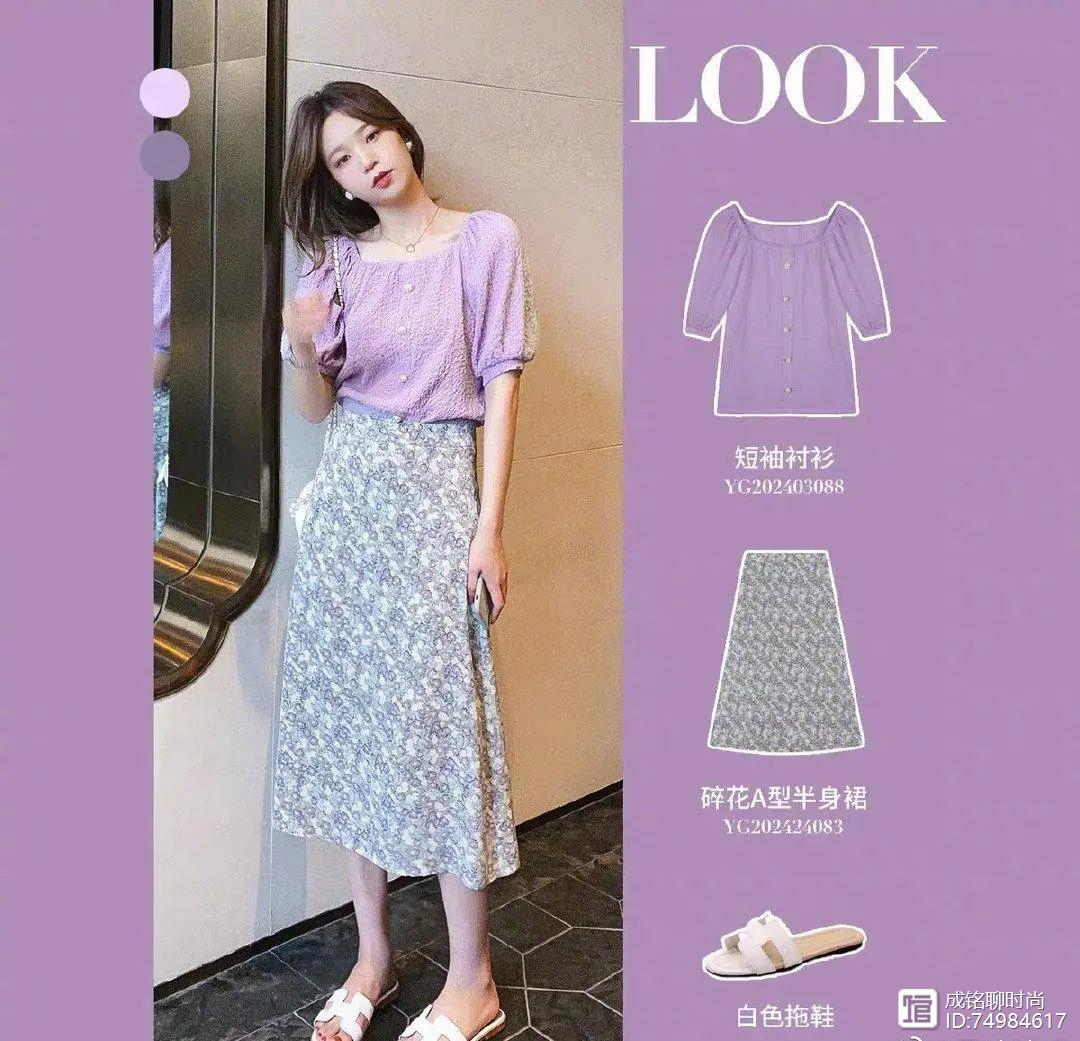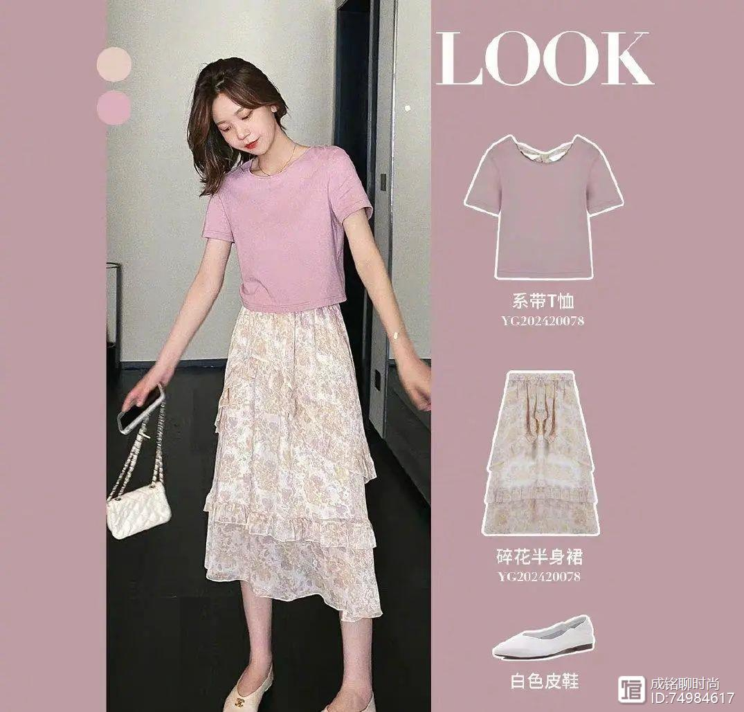 半身裙作为百搭的单品,无论什么风格的设计都能呈现出潮流的魅力。她的这款小上衣采用了简短且纯色的版型,浅粉色不会因为色彩过于饱和形成偏黑的缺陷。她在下身搭配了颜色更浅的碎花裙,这种轻盈的质地很适合这个季节,会营造出清爽的邻家女孩风范。