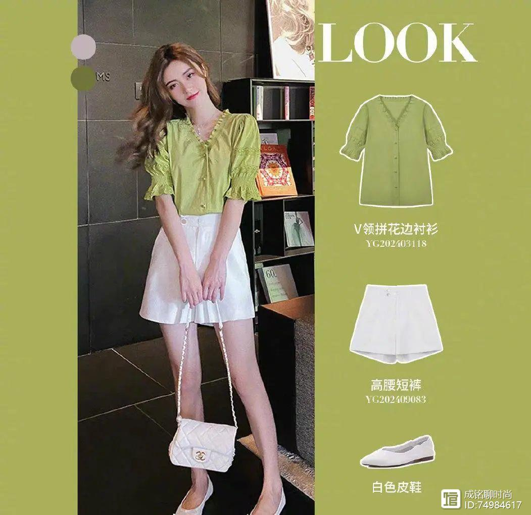 清新色调的小上衣是很显气质的类型,她的这款清新色小上衣用了非常流行的牛油果绿色,在领口和袖口点缀了花边儿,这种设计感很强的衣服适合搭配吊带裙或背带裤,她在下身选择了白色阔腿短裤,类似短裙的设计会露出女生腿部的线条,搭配一款白色的包包,清新与气质并存。
