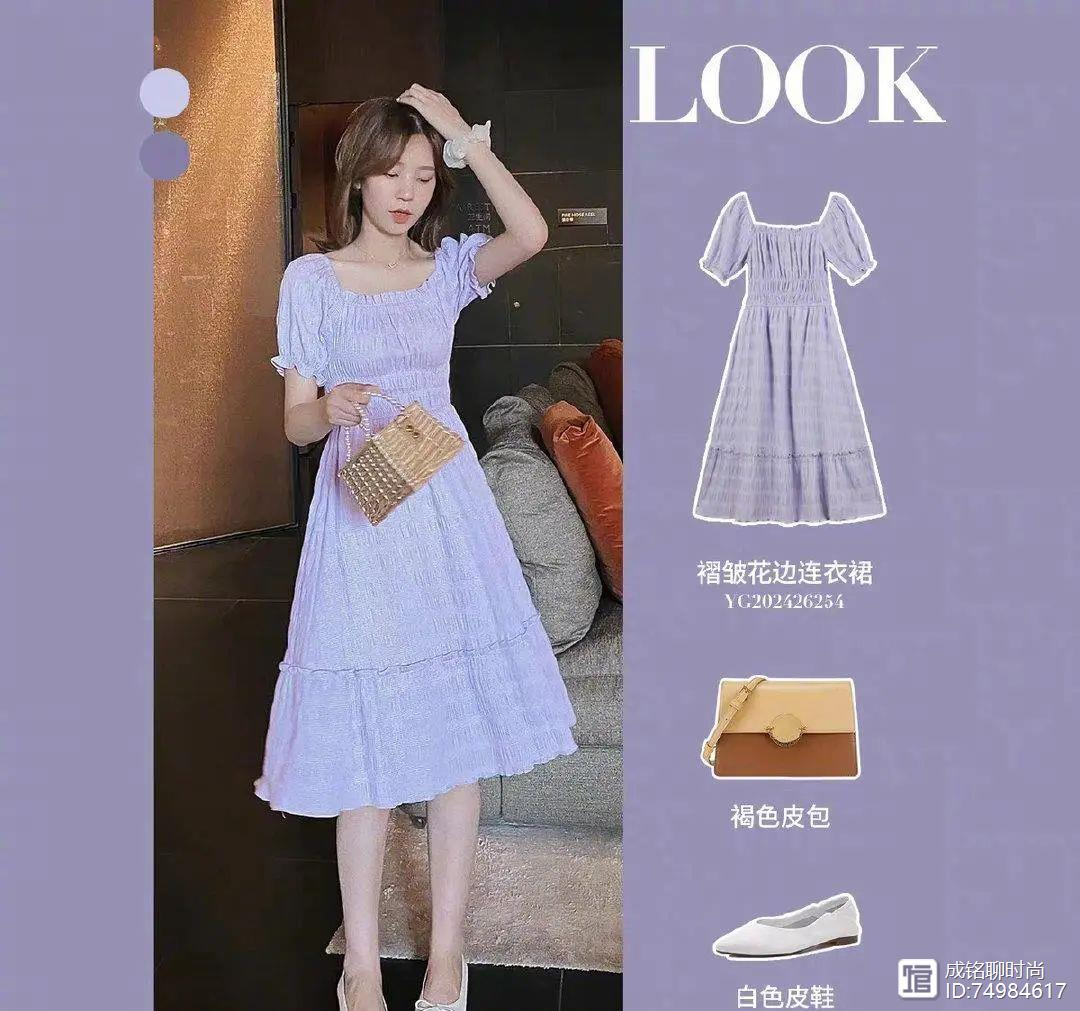 紫色褶皱连衣裙,因为可塑性较好轻松凸显出女生三围的立体,她的这款小上衣在领子处运用大方领的造型,可以露出性感的锁骨线条。把腰带设计在胸部以下会让上身的服装变得格外简短,衬托裙摆的修长,显气质又显女人味儿。她的这款裙子还在边缘部分点缀了很宽松的花边,配上拼接色调的包包,显气质又显个性。