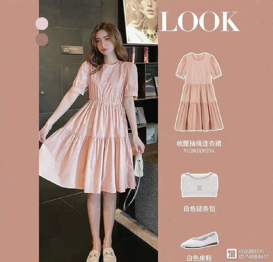 粉色的收腰蛋糕裙可以保留女生格外甜美的状态,她的这款裙子在袖口用了紧口的设计,这样的衣服很考验女生的手臂线条,如果有麒麟臂穿在身上会容易引起紧绷感。在腰部加入丝带束腰,可以呈现出腰部的纤细,也会让服装增加更多褶皱,形成甜美的状态,这样的服装因为色彩单一,所以在选择包包时,与之色调相差较大的格调会更漂亮。