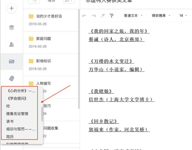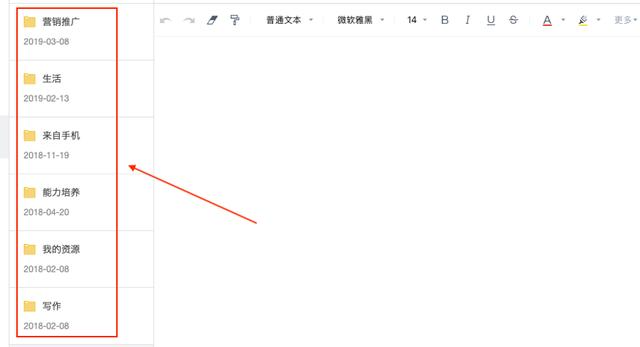 笔记的左侧有6个按钮,其中一个是文件夹的分类。在这个分类中,可以将我们日常收集的知识按照类型分别归纳。再在分类的文件夹里面编辑或收藏相应的知识。比如写作这个文件夹就是我专门拿来收藏写作相关知识的内容。