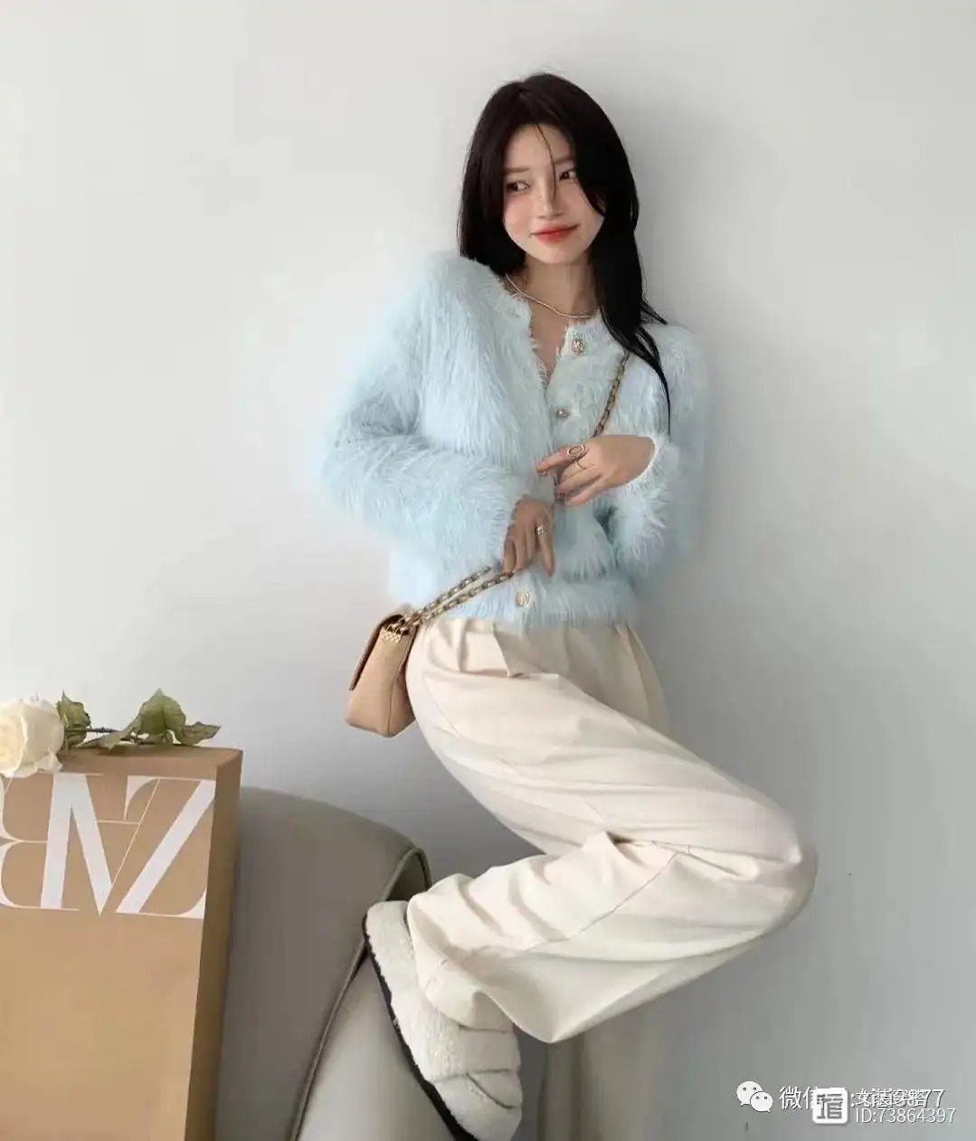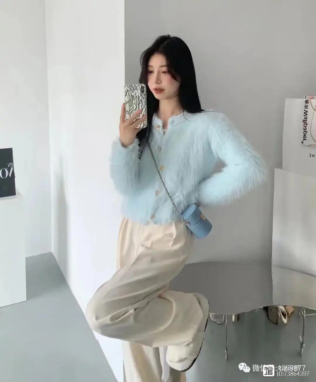 显白的奶油冰蓝色上衣,颜色很嫩软糯糯的,料子是那种浣熊毛,自带暖气,搭配杏色的阔腿裤,慵懒温暖的氛围感拉满,整个也太温柔了吧。