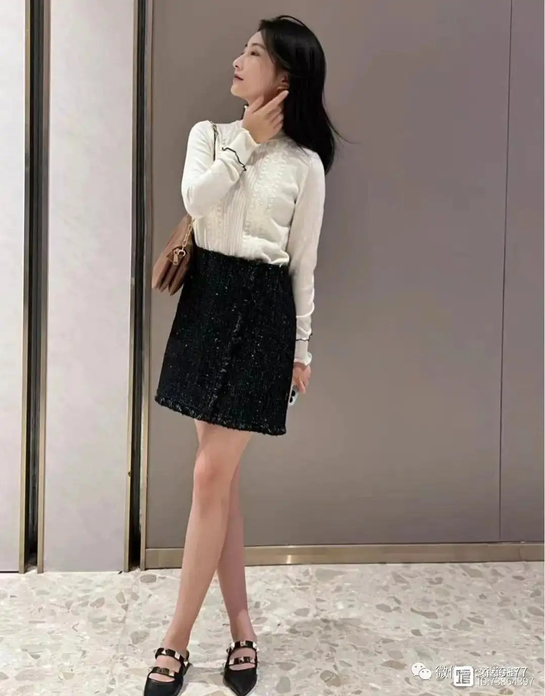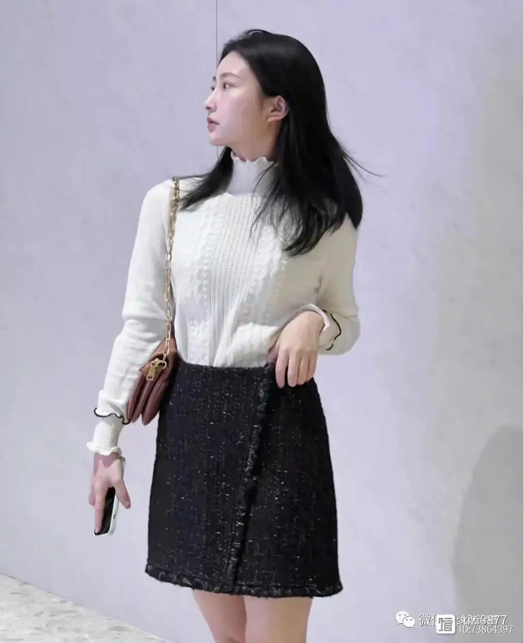 白色半高领毛衣搭配A字裙真的好显瘦,贴身的毛衣很修身,还可以作为内搭,天气还不冷就直接外穿,领口和袖口的花边设计好温柔,搭配黑色毛妮A字裙就是经典的小香风。